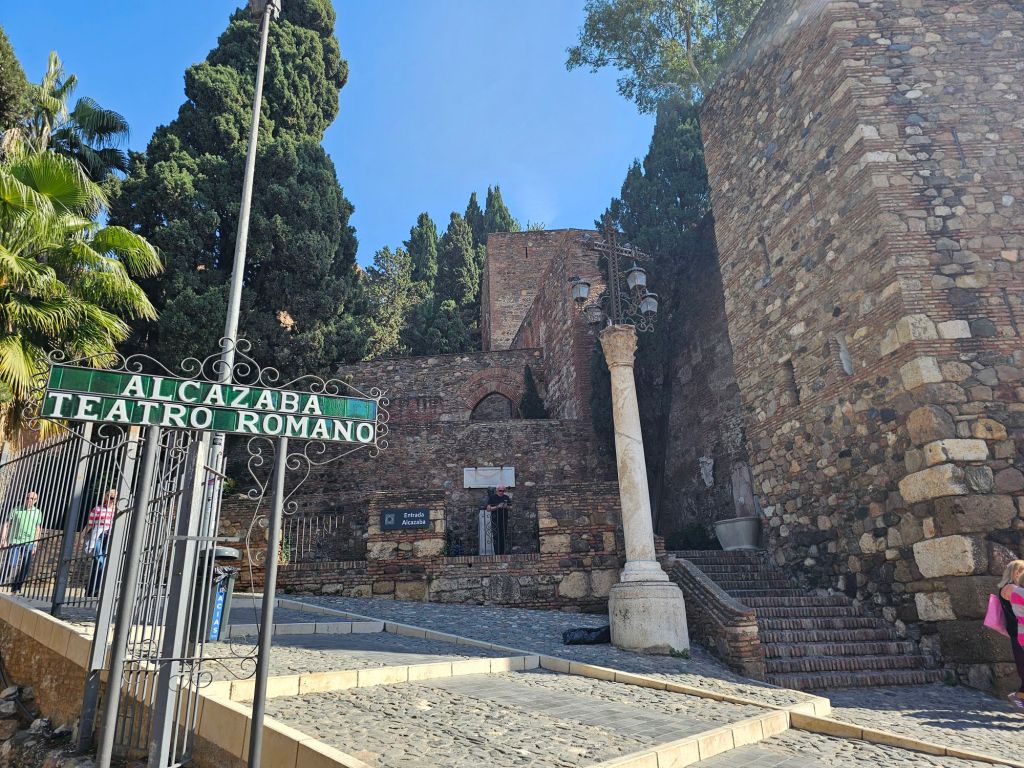 アルカサバ ALCAZABA DE MALAGA の入口。ヒブラルファロ城とは中では繋がっていないので、外壁に沿って降りないと入れません。下から登るのも真夏だときついかも。かなりの急坂なので滑らない底の靴をお勧めします。この看板があるところにツーリスト・インフォメーションがあるので、ここで無料の地図がもらえるのでもらっておくと便利です。
