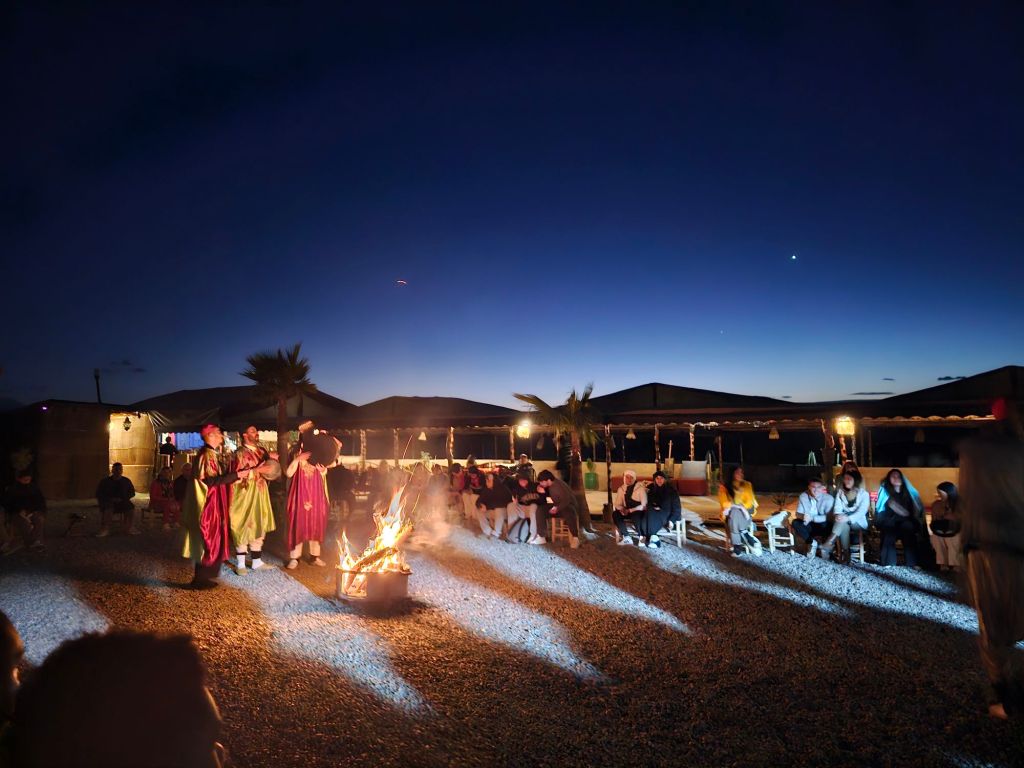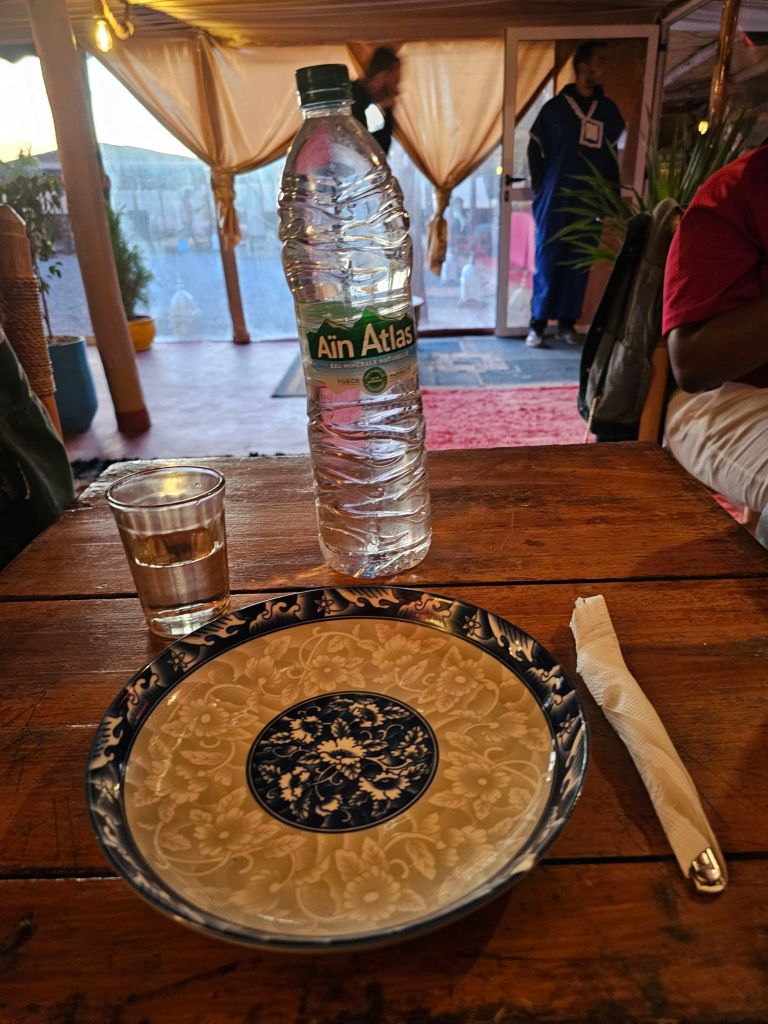 抽出法よりも、伝統的なアルガンの実の収穫方法も見てみたかったなと思いましたが、さすがにそれはなかったです。イギリスもウェールズに行くと、民家の塀や屋根に上ったりしているヤギを目撃することがありますが、そんな感じなのでしょうか。ここでは、買い物する時間もなく、お茶だけ頂いたあとに早速出発。アガフェイ砂漠に着いたら、ラクダ乗りの用意が出来るまで、キャンプ内で伝統的なベルベル族の音楽を聴きました。