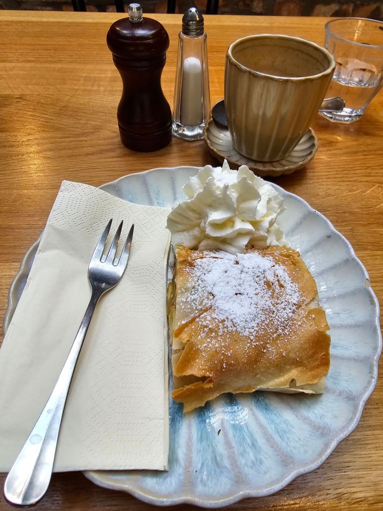 見学も終わったので、博物館に隣接したカフェフリードリヒ Café Friedlichへ。 座っているだけでもワクワクします。もちろん、ここウィーンらしくシュトゥルーデルとカプチーノを注文。Aldiの冷凍シュトゥルーデルに慣れてしまっているので、この甘過ぎず上品なサクサク感に感動しました。 全然旅とは関係ありませんが、一度シュトゥルーデルをリンゴを切るところから作ったことがあります。結構な手間です。