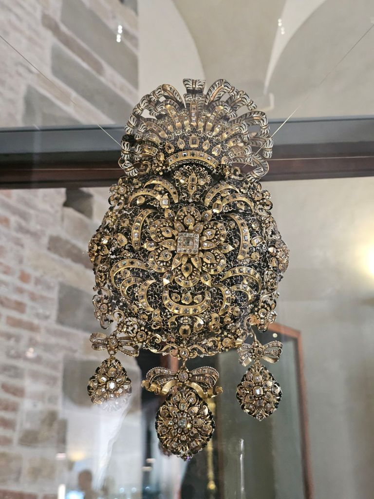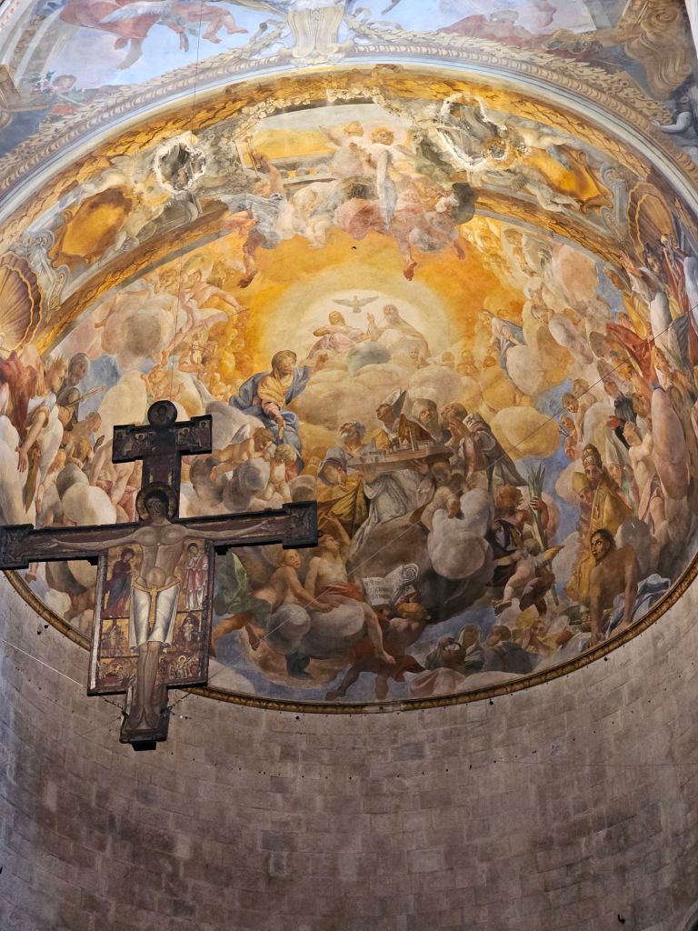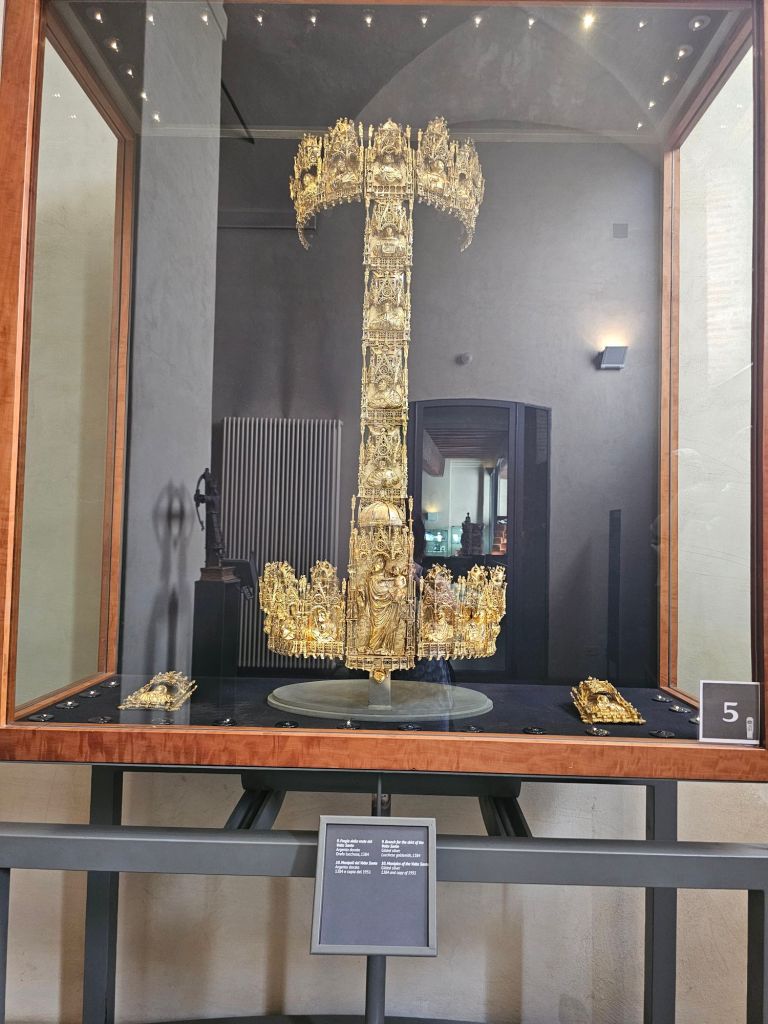 大聖堂の博物館へ入るとすぐに巨大な金製の飾り物が目に入ります。これが上の画像にある木製の十字架にかけられたキリスト像の飾り物で、5月3日と9月14日の年に二回のサンタ・クロスSanta Croceの祭りの際に宝石を散りばめられた金の飾りものをまとうそうです。王冠をはじめ、全て人間の倍はゆうにある大きさで、それらが何げなく展示されているのにも驚きです。ここ、ルッカの大聖堂から教皇アレクサンダー二世が出ているので、当時から相当の権力があったのであろうことも容易に想像がつきます。