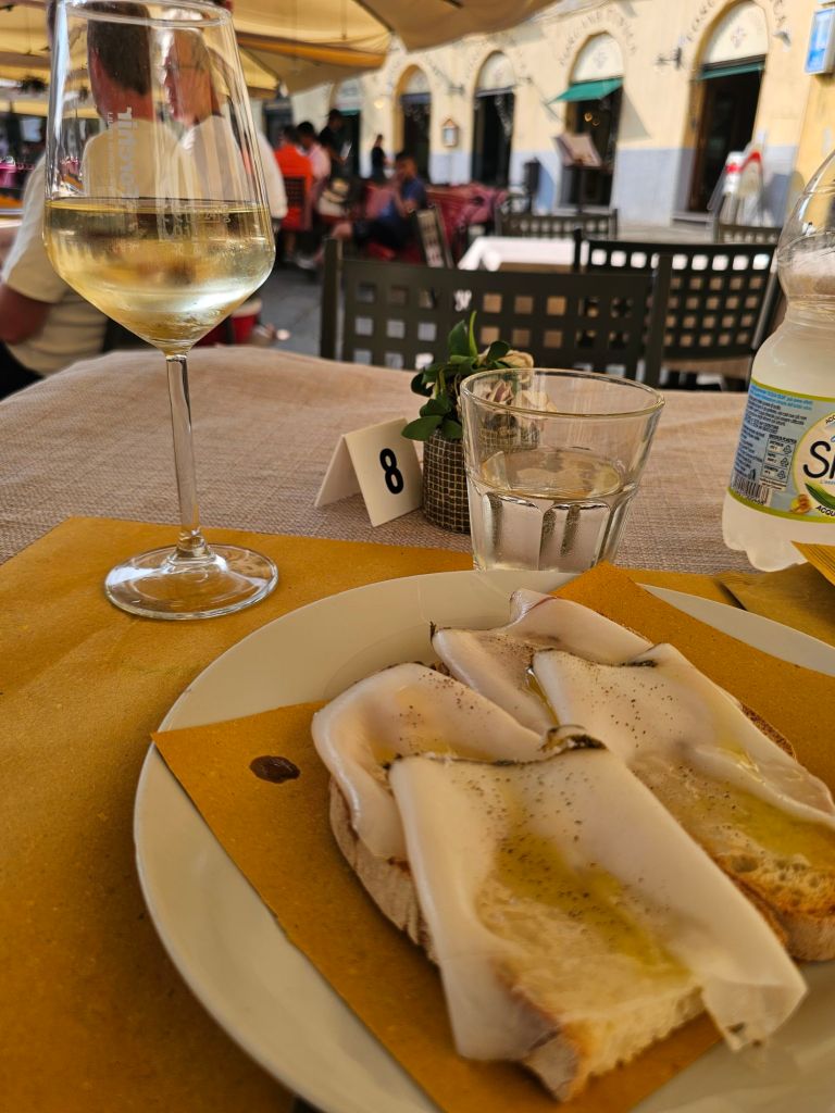 折角の旅先なのでトスカーナ地方の名物で軽く食べられる物を、と聞いて勧められたのがこれ、Lardo di Colooata。豚の背脂を乾燥してマリネしたハムで、イタリア語は全く分からないけれど、ラードという単語が引っかかる…調べたら、かなりしつこそうというかエグイ印象。