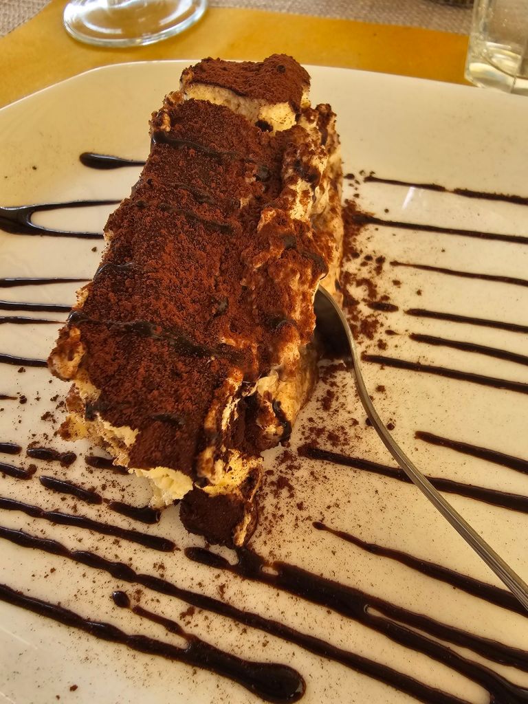 この広場には旅行者向けのレストランが並んでいます。良くも悪くもいかにも観光地ではありますが時間も遅くなってきたのでここで軽く夕飯を。もちろん、ティラミスは外せないし、ワインも外せない。いや、全然飲むほうではないのですが、日帰りだと後で運転するので。