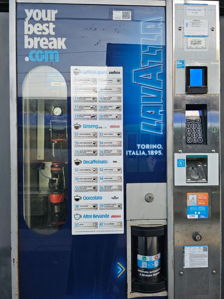 さすがコーヒーの国。ラバッツァの自販機の中にエスプレッソマシンが入っているのが見えるのですが、なんと豆だけではなく淹れる時の圧力計まで見える!それに圧倒的なコーヒーメニューの多さにコーヒー好きとしてはポチッとボタンを押して買って見たかったのですが、電車が来てしまった…うーん、残念。次回だな。って何時になることか。