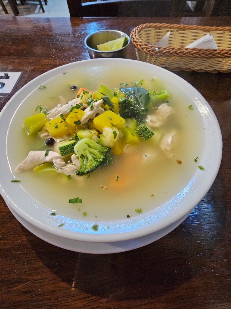 荷物を置いたら、さっそくクスコの旧市街の中心に向かって行き、夕飯を食べるところを探しました。が、あいにくレストランも閉め始めているところが多く、また、あまりお腹が空いていなかったので、とりあえず軽いものをと思い、チキンと野菜のスープにしました。この時はまだ気がつかなかったのですが、この食欲低下って典型的な高山病の症状で、本来ならチキンと野菜のスープは高山病対策として優等生メニュー。意識して選んだつもりだったのですが、やっぱり翌日高山病になりました…