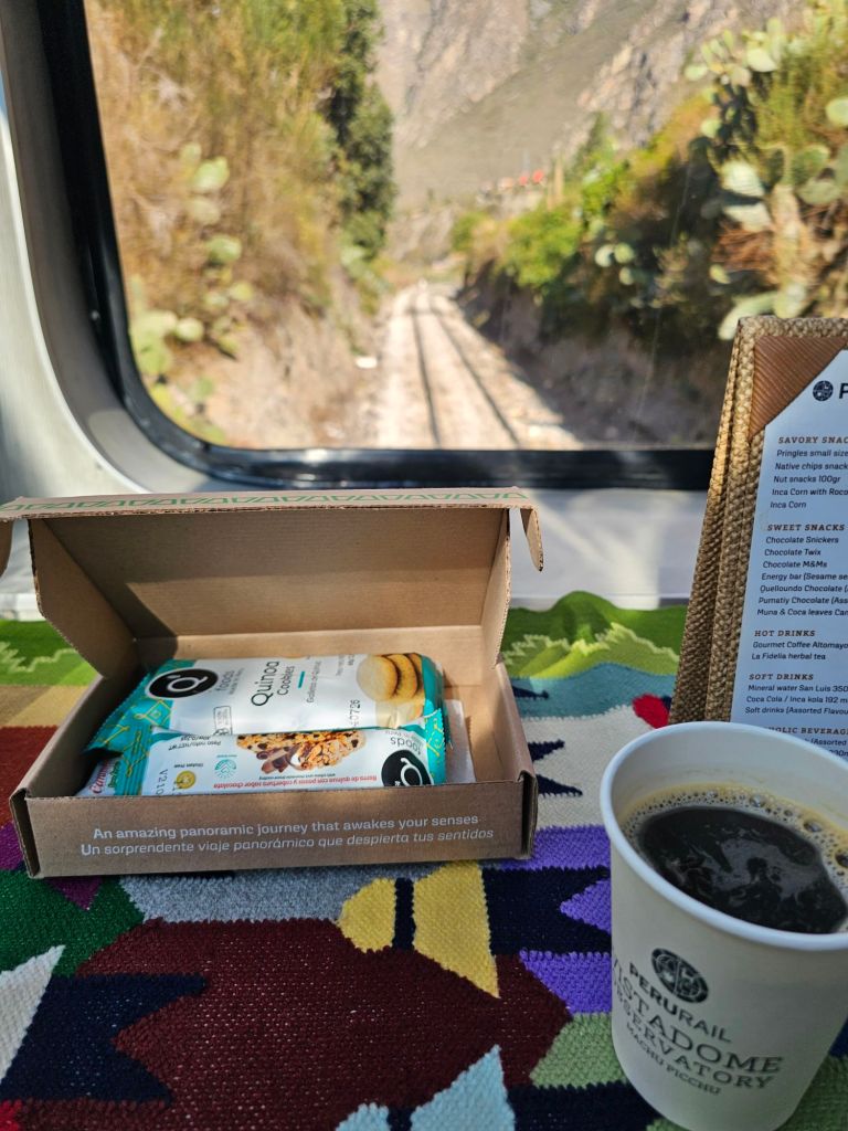 帰りはインカレイル。行きで奮発したし帰りはもう既に景色を見ているから一番安いVoyagerヴォイジャーで十分だよね…と、クスコまでを購入しました。$70(US ドル)でした。この時点で距離的にもベーシックな普通席はかなり安く感じます。それでもかなり高いのですが…マチュピチュ村駅に行ったらなんとファーストクラスという上のクラスの車両にアップグレードされていました!乗車したら既にテーブルセッティングまでしてあってテンションが上がりました。まあ、午前中からチーズケーキが出るとは思いもよりませんでしたが、車内でも駅でも生演奏付きだったし、座席は革のふかふかのシート。もちろん追加料金なしだったので私個人の感想としてはインカレイルに軍配を上げます。ちなみにチケットを一応印刷して行きましたが、こちらもインカレイルの方が断然分かりやすく読みやすい表示でした。