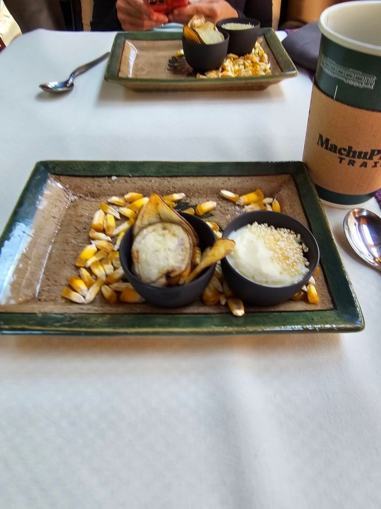 ビスタドームは上部まで見える観覧窓で、スナック付き。しっかり車内販売もしていましたが車内でのアトラクションがHPにはあるとあったのに、なくてちょっとがっかり。座席が先頭車両の一番前だったので景色は最高でしたが、他の乗客が写真を撮りに次々と来たので、はっきり言ってプライバシーはありませんでした。他の乗客は、一番いい席だね!と言ってくれましたが、それはないと言い切れます。スナックはキヌアのお菓子とコカの飴が入っていました。インカ帝国の遺跡が見える所では案内のアナウンスも入るし、ウルバンバ川を見ながら揺られているとマチュピチュへの期待がマックスになってきました。