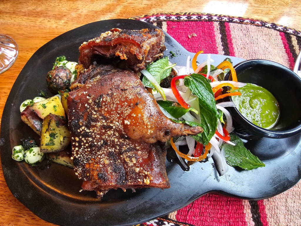 初日は、チャレンジャーなので、クイを食べました。このクイはこちらではギニーピッグ、子供達にペットとして人気の小動物です。天竺ネズミというか、モルモットなのですが、さすがに一匹は食べられないし頭つきの丸焼きとか出てきたらトラウマになりそうと言ったら、ガイドさんが半身で頭なしのローストを注文してくれました。味は、ありきたりだけどチキン…いや、正確にはキジとかウサギといったゲームミートに近いかな。皮の内側に結構脂肪がついていて、皮も硬かったので、うーん、私はアルパカだけでいいです。