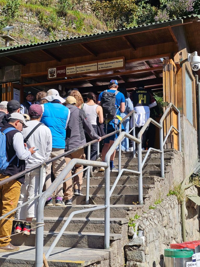 さあ、遂にやって来ました。マチュピチュ遺跡入り口! トイレは大丈夫ですか? 中にトイレはありません。入る前に済ませておきましょう(2ソル)また大きな荷物等もここに預ける事ができます。ウォーキングポールは禁止ですが歩行に必要な杖は、先にゴムのキャップが付いていれば中で使うことができます。
