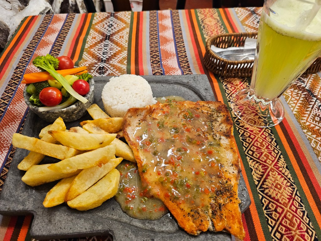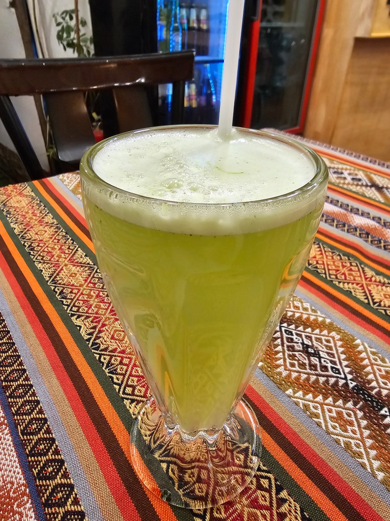 夕飯は、昼が肉だったので鱒のグリルライムソース。ペルーの海域では鮭が捕れないので、鱒がメインなのだそう。ここでフレッシュのレモネードを飲んだのですが、今までに飲んだレモネードとはかなり違うというか。色もちょっと緑がかかっていたけれど、味もコリアンダーが入っているような。でも、とても美味しかったです。作り方を知りたいと思ったほど。
