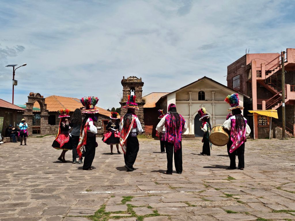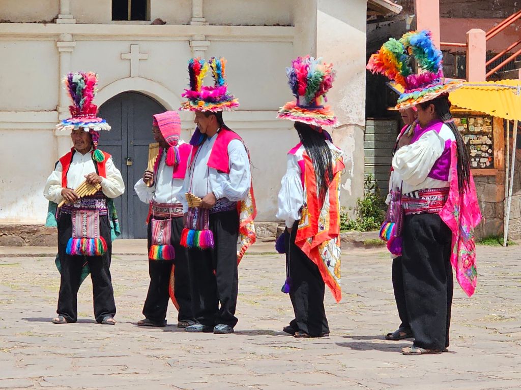 広場まで、約40分程かかりました。空気が薄いので30秒登ったら息を整えるという感じです。広場に着いたら民族衣装をまとった地元の人たちの踊りでお迎え。ここの織物はユネスコの無形文化遺産で織物を作るのは男性の仕事だそうです。