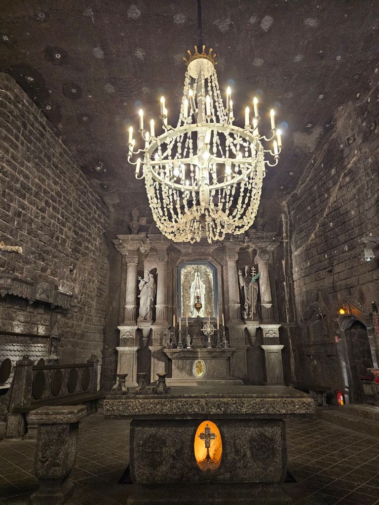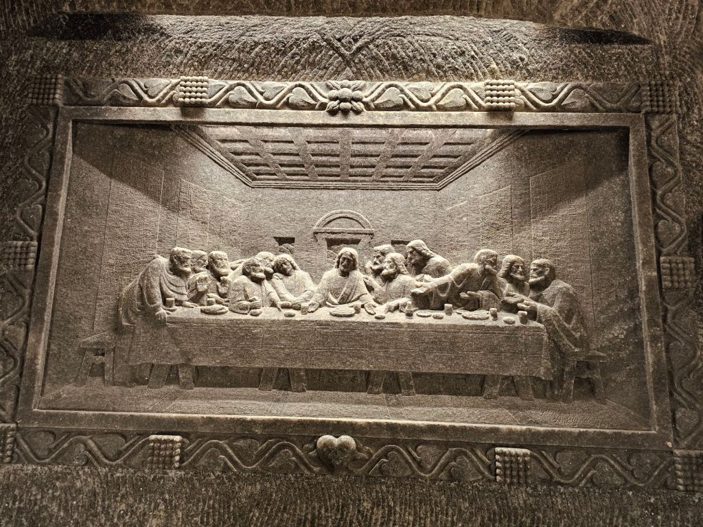 ツアーはまだまだ続き、行くと礼拝堂に出ます。この礼拝堂では毎週ミサが行われていて誰でも参加できるのだそう。このシャンデリアのクリスタルの部分も塩。レリーフもプロのアーティストではなくて元は炭坑夫の素人だというのも驚きです。