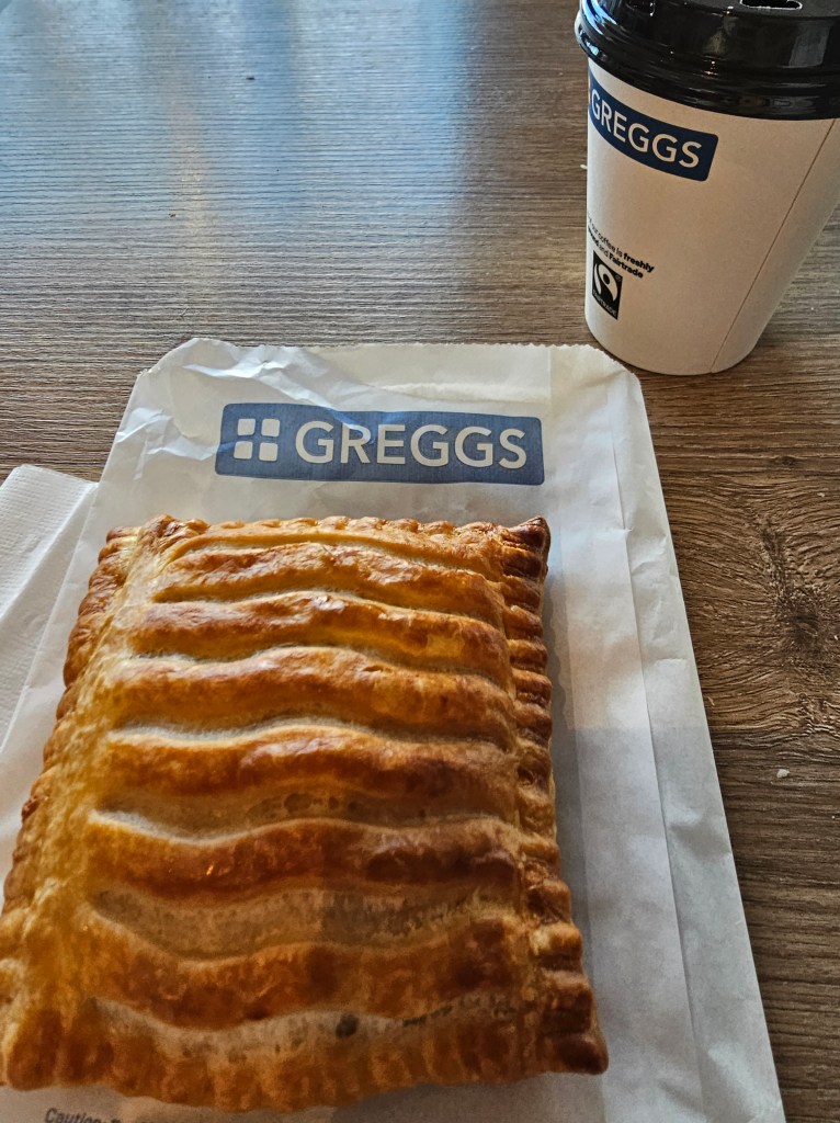 小腹が空いたので、空港に到着したらまずは英国庶民の味、グレッグスに寄りました。チキンパスティとコーヒーで小腹を満たした後は保安検査場へ。