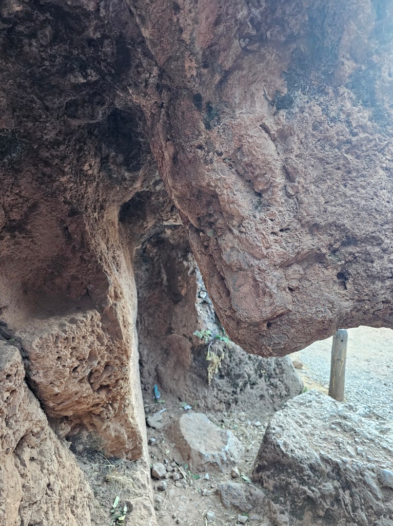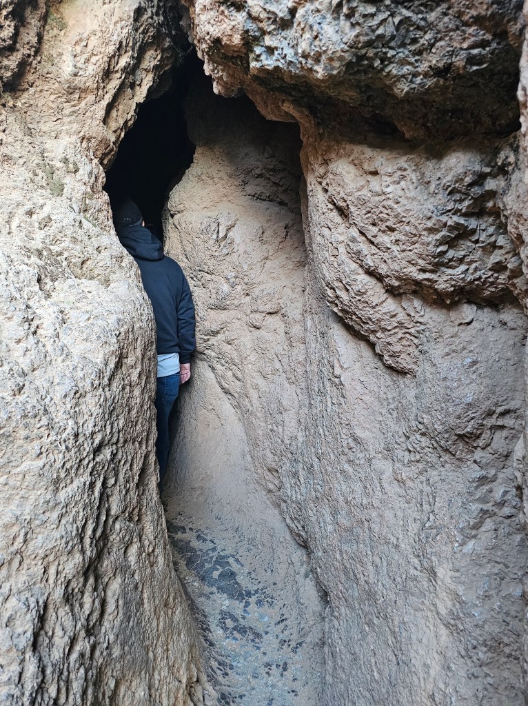 前回のケンコー遺跡の方は中でミイラを作ったとか骨が多数出土したとか聞いて何とも言えない雰囲気がありましたが、こちらは入り口からして狭く、人が一人屈んで歩いて通るのがやっと。光が全く入らない岩石のトンネルで、とりあえず何も見えないので、前の人の声をたよりに手を四方八方に広げて手探りで出口を探すという、このなんとも言えない怖さが、ここにはありました。ちょっと慣れてくると洞窟が緩い左回りの螺旋を描いているのがわかりましたが、それでも目の前が真っ暗。
